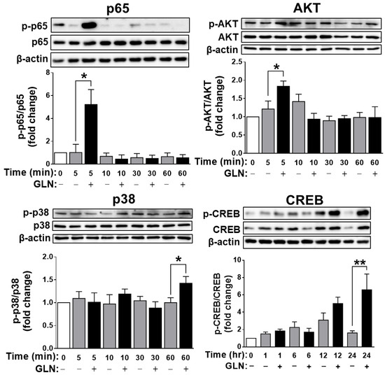 To explore the signaling pathways involved in GLN-induced FGF21 expression and given that under the different physiological conditions in different cell types, previous studies demonstrated involvements of a variety of signal pathways in FGF21 expression, at least including NF-κB [41], cAMP/PKA and MAPK p38 [41], Akt [41,45], and PPARα and PPARγ [46], selective inhibitors against these diverse signaling molecules were employed. In HT22 cells, inhibitors for NF-κB, p38, JNK, Akt, PKA, and PPARα suppressed GLN-induced FGF21 production (Figure 5A). In STHdhQ7/Q7 cells, inhibitors for NF-κB, p38, Akt, PKA, and PPARα also reduced GLN-induced FGF21 production (Figure 5B). Further analysis in HT22 cells revealed the rapid induction of p65 and Akt phosphorylation at 5 min, p38 phosphorylation at 60 min, and CREB phosphorylation at 24 h by GLN (Figure 6), while JNK phosphorylation was unaffected by GLN (Supplementary Figure S6). In STHdhQ7/Q7 cells, GLN induced p65 phosphorylation at 5 min and p38 and Akt phosphorylation at 60 min (Supplementary Figure S7). To monitor the effect of GLN on PPAR signaling, the HT22 or STHdhQ7/Q7 cells were transfected with a PPRE reporter plasmid, and GLN did not activate but reduced the PPRE reporter activity (Supplementary Figure S8). To test the critical role of NF-κB in GLN-induced FGF21 expression, HT22 cells were transfected with either EGFP or EGFP-RelA (p65) overexpression plasmid and then treated with or without GLN for 24 h. The transfection of HT22 cells with EGFP-RelA (p65) overexpression plasmid and subsequent GLN treatment resulted in a more profound induction of FGF21 compared with that in the EGFP control group (Figure 7).