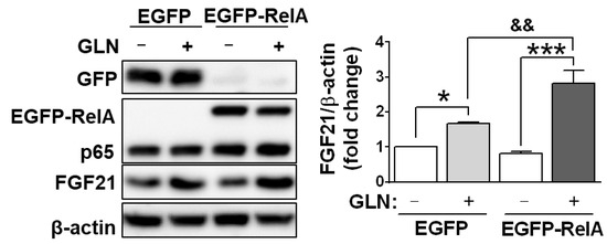 Demonstration of the further induction of FGF21 through overexpression of NF-κB p65 in HT22 cells. HT22 cells were transfected with EGFP-p65 or EGFP plasmid and treated with GLN (20 mM) for 24 h. Western blotting was performed to detect the proteins for FGF21, GFP, EGFP-RelA, and p65 using β-actin as an internal control. The results represent the means ± S.E.M. (n = 3). * p < 0.05 and *** p < 0.001 compared with the 0 mM group. && p < 0.01 between the EGFP and EGFP-RelA groups.