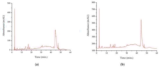 The results of the evaluation of the chemical composition of the extracts (in terms of total phenolics and the concentration of target compounds) is presented in Table 1, while the corresponding chromatograms are presented in Figure 1.