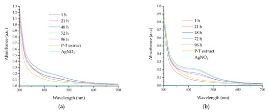 Regarding the phytosynthesis process, Figure 3a,b illustrate the appearance of distinct silver nanoparticle absorption maxima (400–450 nm) for both synthesis methods when utilizing pomace extracts obtained by classical temperature extraction. In the case of the sample P-T-Ag1, the appearance of the absorption maximum specific to silver after 1 h from the initiation of the synthesis can be noted (in a 1:1 ratio of pomace extract: silver nitrate solution). The nanoparticles synthesized with a ratio of 1:2 of extract: silver salt solution displayed much clearer definition in their maximum absorption peaks. In both cases, the peaks tended to shift towards shorter wavelengths, indicating a hypsochromic effect. This effect can be attributed to the gradual reduction in nanoparticle size over time. Additionally, the smallest displacement from the initial maximum position was observed with a shift from 440 to 434 nm in the case of the P-T-Ag2 sample.
