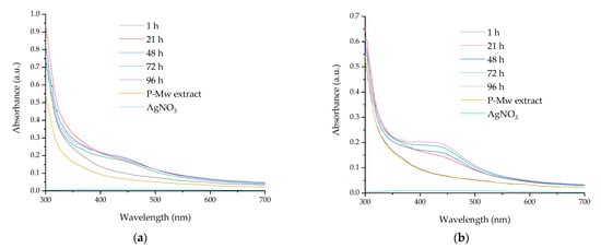 UV–Vis spectra of the nanoparticles synthesized using extract obtained by microwave-assisted extraction: (a) P-Mw-Ag1 sample; (b) P-Mw-Ag2 sample.