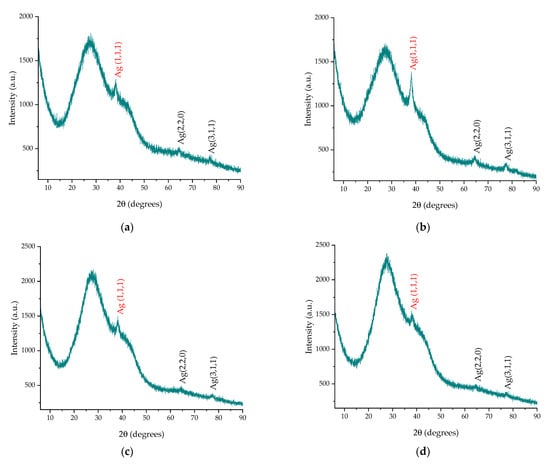 The X-ray diffraction results provided valuable insights into the crystalline structure of the phytosynthesized nanoparticles. The diffractograms of the samples are presented in Figure 4. In order to perform the analysis, the samples were centrifuged using a DLAB DM0408 (China) laboratory centrifuge at 4000 rpm for a duration of two hours. After removing the supernatant, the samples were deposited on a glass support for analysis. From the analysis of the results, the samples displayed three diffraction peaks at 38°, 64°, and 77°, which corresponded to the diffraction planes (111), (220), and (311), respectively, and the phase could be identified as Ag in a cubic crystalline system, as determined by comparison with the ICDD entry 01-087-0719. Table 3 presents the calculated crystallite dimensions using Equation (2).