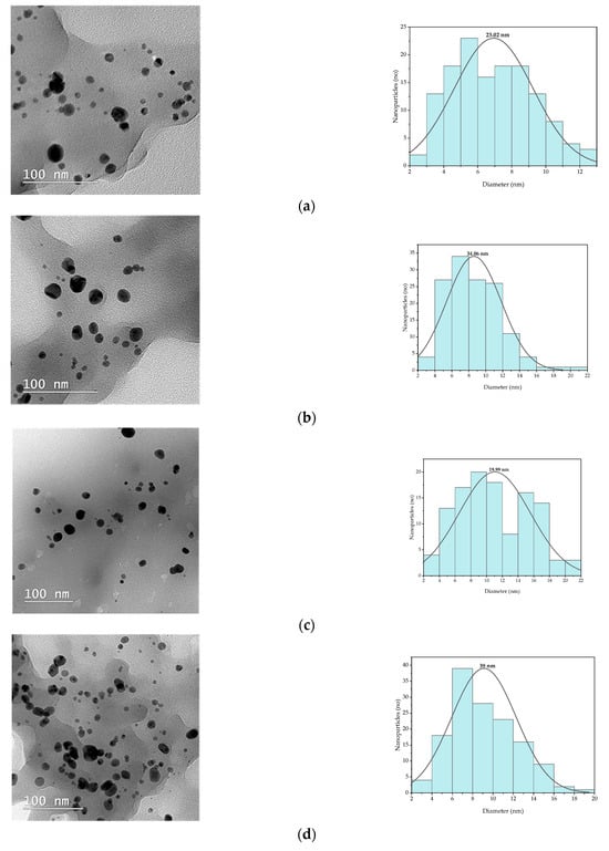 TEM images and size distributions obtained for the phytosynthesized nanoparticles: (a) sample P-T-Ag1, (b) sample P-T-Ag2, (c) sample P-Mw-Ag1, (d) sample P-Mw-Ag2.