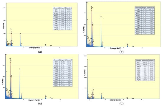 EDX spectra of samples: (a) P-T-Ag1; (b) P-T-Ag2; (c) P-Mw-Ag1; (d) P-Mw-Ag2.