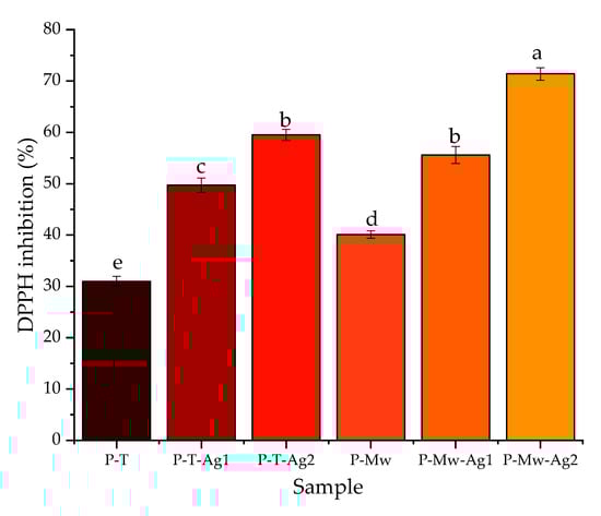 The DPPH antioxidant assay revealed an increase in the antioxidant potential of the phytosynthesized nanoparticles compared with the parent extracts, as well as a superior antioxidant potential of the extract obtained by the microwave-assisted method (compared with the temperature extraction method). At the same time, the antioxidant potential was found to vary in a concentration-dependent manner with the silver content. Expressed as quercitin equivalents, the results were found to vary from approx. 0.66 to approx. 3.64 mg QE/L (temperature extraction vs. microwave-assisted extraction). For the same extraction procedure, the silver concentration dependency of the antioxidant capacity of the phytosynthesized nanoparticles can be expressed (as quercetin equivalents) as follows: approx. 2.03 mg QE/L (P-T-Ag1) vs. 2.76 mg QE/L (P-T-Ag2) and approx. 2.47 mg QE/L (P-Mw-Ag1) vs. 3.63 mg QE/L (P-Mw-Ag2), respectively. These findings are in good concordance with literature data, with several authors presenting the antioxidant potential of grapevine wastes extracts, as determined using DPPH assays [,]. A direct comparison with the literature data regarding antioxidant potential is often a difficult endeavor considering the differences in the extraction procedure, antioxidant assays performed, standard antioxidant used, and reporting method. Other authors have observed a dose-dependent increase in the DPPH inhibition percentage using grape pomace extracts obtained by different methods, reaching an inhibition of over 70% for a 7.5 mg/L extract concentration, which is superior to the antioxidant potential of ascorbic acid (used as a standard) at similar concentrations []. Using different solvents (methanol, ethyl acetate, and water), Murthy et al. [] evaluated the antioxidant potential of grape pomace extracts at different concentrations, as determined by a DPPH assay, obtaining inhibitions of from 9.1 to 42.1% (at a concentration of 50 mg/kg) in a solvent-dependent manner. At the same time, Zhu et al. [] identified a direct correlation between the total polyphenol content and the DPPH scavenging ability of grape pomace extracts; this correlation could also explain the differences recorded in our study regarding the antioxidant potential of the two extracts. Also, phytosynthesized silver nanoparticles have commonly been found by other authors to significantly increase the antioxidant activity of the parent extract [] in a silver-concentration-dependent manner [], which is in good agreement with the results of the present study.