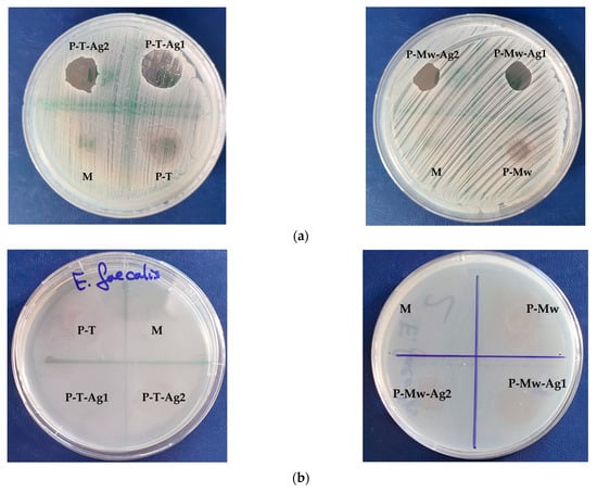 Aspect of qualitative studies (ZOI) results of pomace extracts obtained by classical temperature extraction (P-T) and microwave-assisted extraction (P-Mw) and the nanoparticles phytosynthesized through them (P-T-Ag1, P-T-Ag2, P-Mw-Ag1, and P-Mw-Ag2): (a) tests on Staphylococcus aureus ATCC 25923; (b) tests on Enterococcus faecalis ATCC 29212.