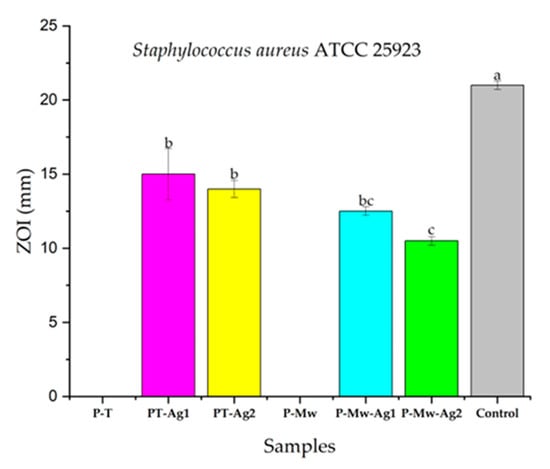 After conducting the qualitative screening, the antimicrobial effectiveness of the samples against the Staphylococcus aureus ATCC 25923 strain was observed by examining the presence of a growth inhibition halo. This was observed in case of P-T-Ag1, P-T-Ag2, P-Mw-Ag1, and P-Mw-Ag2. The sample P-T-Ag1 exhibited the largest diameter of the inhibition zone (ZOI), measuring 15 mm, while the smallest diameter was observed in the case of the P-Mw-Ag2 sample, measuring 10 mm. The aspect of the qualitative studies (Petri dishes) is presented in Figure 8, and the results are presented in Figure 9. For the Enterococcus faecalis ATCC 29212 strain, none of the samples led to the apparition of an inhibition halo.