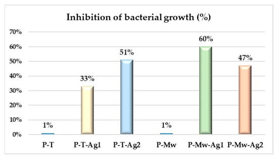 Sample P-Mw-Ag1 (having an average nanoparticle diameter of 19.99 nm) showed the highest efficiency, inhibiting 60% of bacterial growth at a concentration of 0.05 mg/mL. Sample P-T-Ag1 (23.02 nm) showed the lowest efficiency, inhibiting 33% of the growth of the S. aureus strain at a concentration of 0.0125 mg/mL. Samples P-T-Ag2 (34 nm) and P-Mw-Ag2 (39 nm) showed almost similar efficiencies, inhibiting 51% and 47% of the bacterial growth at a product concentration of 0.025 mg/mL.