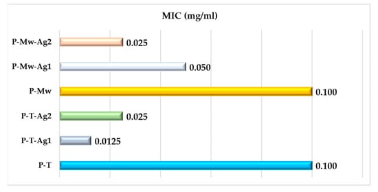 Following the quantitative test (MIC), an efficiency against S. aureus was observed. A graphic representation of the percentage of bacterial growth inhibition is presented in Figure 10, while the MIC values are given in Figure 11. The final antimicrobial properties were not significantly affected by the variations in the dimensions of the nanoparticles. The results obtained are superior to those reported by Parvekar et al. [] regarding the MIC value recorded for commercial AgNPs (0.625 mg/mL), underlining the important contribution of the phytoconstituents to the final biological properties of the materials. Compared with the literature data regarding phytosynthesized silver nanoparticles, the obtained results revealed slightly lower minimal inhibitory concentrations (although comparable) than the values obtained by Giri et al. [] on the application of silver nanoparticles obtained using Eugenia roxburghii DC extract.