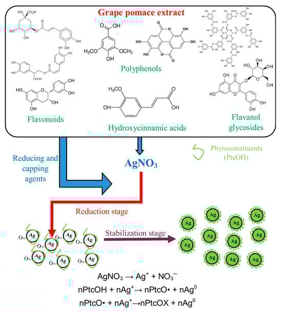 Considering the obtained results as well as our previously published works, a mechanism for the phytosynthesis of silver nanoparticles using grape pomace extracts can be proposed (Figure 12).