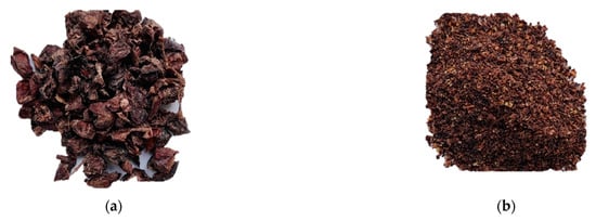 The grape pomace (originating from the native genotype Fetească Neagră 6 Șt.; maintainer: National Research and Development Institute for Biotechnology in Horticulture, Stefanesti, registration certificate number 1698/2005) samples were collected immediately after pressing the grapes. To avoid oxidation, the samples were stored in vacuum bags at −20 °C. Before starting the experiments, the samples were subjected to a drying procedure using a JW-MW-6 KW microwave oven at a temperature of 65 °C (Figure 13a). Finally, the dried pomace samples were shredded using a laboratory mill (Figure 13b).