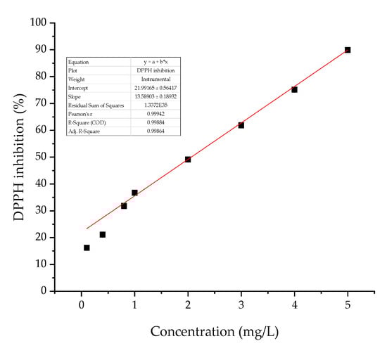 Furthermore, in order to provide a clear image of the antioxidant properties of the extracts and the phytosynthesized nanoparticles, quercetin (Sigma Aldrich, St. Louis, MO, USA) was used to construct a calibration curve (in the range 0.1–5 mg/L). DPPH inhibition percentages were plotted against the concentration, and the linear fit function was applied; the calibration equation calculated was y = 21.991 + 13.589 × (R2 = 0.9986) (Figure 14). The results obtained for the extracts were reported as mg quercetin equivalents (mgQE)/L using the above-mentioned equation.