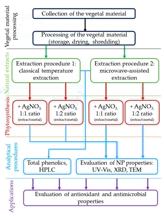 Moreover, nanotechnology has emerged as a crucial tool in advancing large-scale technologies across various fields with an emphasis on obtaining different materials with potential for medical applications [], including the use of silver nanoparticles as potent antimicrobial agents against multidrug-resistant bacterial strains [] or to control oxidative stress and improve the immune system [], these aspects being the subject of numerous reviews in the last years. Additionally, innovative methods such as phytosynthesis have made a great contribution to the field of nanotechnology by eliminating the need for hazardous substances [,,]. This not only reduces associated costs but also ensures reproducibility and accelerates the material development process []. In phytosynthesis, natural extracts obtained through different extraction techniques are used as reducing agents and surface stabilizers for nanoparticles, thereby minimizing the potential toxicity associated with their use [,].