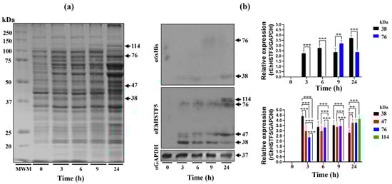 Induction and immunodetection of the oligomeric states of the rEhHSTF5 protein. The integrity of the total proteins extracted from transformed and IPTG-induced bacteria was evaluated by SDS-PAGE. A Molecular Weight Marker (MWM) and IPTG induction times ranging from 0 to 24 h were included. The gel was stained with Coomassie Brilliant Blue G-250 to visualize the protein bands (a). Subsequently, immunodetection was performed by Western blot assays using α6xHis and αEhHSTF5 specific antibodies to detect the distinct conformations of rEhHSTF5 (b). The graphs display the relative protein expression, calculated as the average of the pixel values obtained from three independent samples. Expression was normalized using the positive control, αGAPDH. The statistical analysis was performed using a two-way ANOVA, followed by the Tukey’s multiple comparison test. Significant differences between experimental groups are denoted with (*). The significance levels used were ** p ≤ 0.002, and *** p ≤ 0.001.