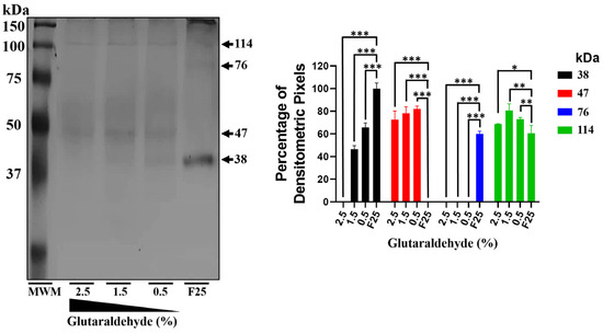 mrEhHSTF5 oligomerization induction with increasing concentrations of glutaraldehyde. We used the mrEhHSTF5 protein without glutaraldehyde as a negative control. Oligomerization states were evaluated by 12% SDS-PAGE gel electrophoresis stained with Coomassie Brilliant Blue G-250. The statistical analysis was performed using a two-way ANOVA, followed by the Tukey’s multiple comparison test. Significant differences between experimental groups are denoted with (*). The significance levels used were * p ≤ 0.033, ** p ≤ 0.002, and *** p ≤ 0.001.