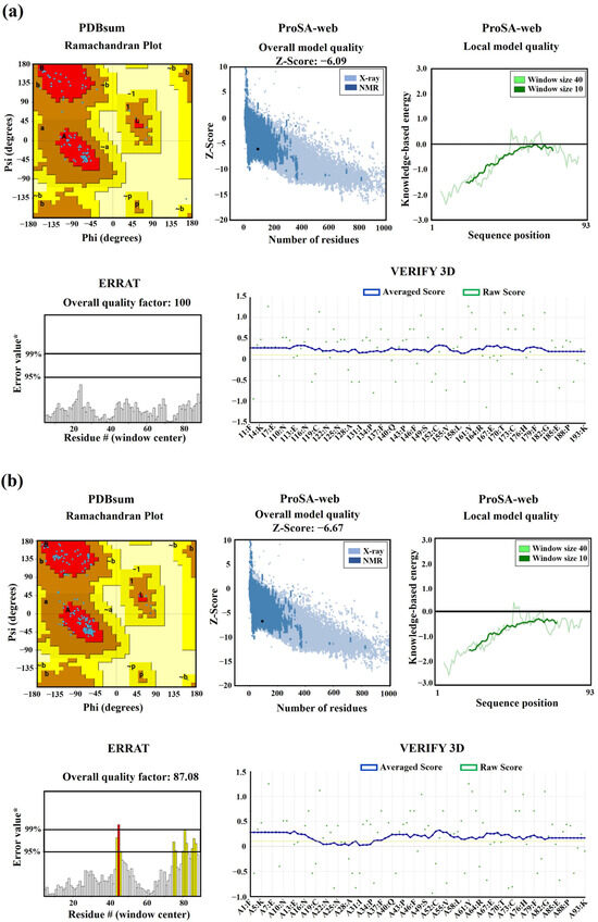 Validation of 3D structures. The 3D models mEhDBD5 (a) and dEhDBD5 (b) were validated using Ramachandran analysis, which provides detailed information about the distribution of dihedral angles of amino acids in favorable and unfavorable regions. The capital letters A, B, and L are used to designate the Most Favored Regions, while the lowercase letters a, b, l, and p represent the Additional Allowed Regions. The tilde (~a, ~b, ~l, ~p) is utilized to indicate the Generously Allowed Regions. Furthermore, a value of −1 is assigned to a torsion angle located within a non-permissible region. The models were subjected to the ProSA-web server for a validation based on the Z-score (the black dot on the graph represents the Z-score assigned to our 3D structure) and global energy, where values ≤ 0 indicate absence of structural errors. ERRAT was used for error quantification, where an asterisk (*) indicates the error value. White bars in the graph represent instances without structural errors, while yellow bars indicate amino acids with structural errors falling within the 95–99% error range, and red bars identify errors exceeding 99%. Verifying 3D structures validates protein structures by evaluating their 3D conformation through comparison to a set of experimental structures. It assigns a score, suggesting an acceptable average 3D−1D score of ≥0.1 for validation.