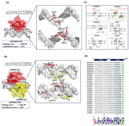 Molecular docking and intermolecular evaluation of the mEhDBD5-HSE_EhPgp5 and dEhDBD5-HSE_EhPgp5 complexes. Blind dockings were performed with the domains mEhDBD5 or dEhDBD5 and the HSE_EhPgp5. Using the PLIP server, intermolecular interactions of amino acids involved in the interaction with the sense and anti-sense strands of HSE were estimated. A close-up of the area of interaction is shown in the boxes, where amino acids from mEhDBD5 (EhDBD5(1)) are illustrated in red, while the analogue of the second EhDBD5 domain from dEhDBD5 (EhDBD5(2)) is shown in yellow (a,b). The amino acids involved in the interaction with the amino acids of the mEhDBD7-HSE, KlHSTF-HSE, HsHSTF1-HSE, and HsHSTF2-HSE complexes were compared (c). The high conservation degree of α2-helix and α3-helix of DBDs from 28 species, including the EhHSTFs family, is shown (d). In the alignment with the Clustal Omega server, asterisks (*) indicate amino acids that are identical across all sequences. Colons (:) represent conserved substitutions with similar properties, and a period (.) points out semi-conserved substitutions with some functional similarity. The analysis of the physicochemical properties of the complexes revealed that the dEhDBD5-HSE_EhPgp5, containing an additional monomer compared to the mEhDBD5-HSE_EhPgp5, demonstrated more significant aromatic interactions, hydrogen bonds, and charges. This complex also exhibited an increased hydrophobicity and a higher ionization capacity. Furthermore, it possessed a more extensive solvent-exposed surface area than its monomeric counterpart, mEhDBD5-HSE_EhPgp5 (Supplementary Figure S3).