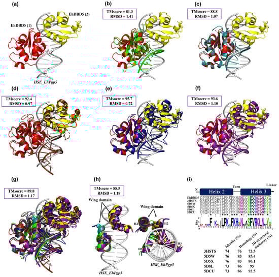 The 3D structural similarity between DBDs–HSEs complexes. Based on the obtained dEhDBD5-HSE_EhPgp5 complex (a), overlay comparisons were performed with crystallographic structures deposited in the PDB database. These included the K. lactis DBD-HSE complex (ID: 3HTS) (b), S. cerevisiae-C. thermophilum complex (ID: 5D5X) (c), H. sapiens-C. thermophilum complex (ID: 5D5W) (d), synthetic H. sapiens construction (ID: 5D8L) (e), and H. sapiens (ID: 7DCU) (f). A joint overlay of all these structures was performed (g) and focusing solely on the wing domain (h). In addition, a significant degree of conservation was identified through the alignment of amino acid sequences of helices 2 and 3 (i). The squares illustrate the TM-scores in percentages, while the RMSD is in Angstroms (Å). In the alignment with the Clustal Omega server, asterisks (*) indicate amino acids that are identical across all sequences. Colons (:) represent conserved substitutions with similar properties, and a period (.) points out semi-conserved substitutions with some functional similarity.