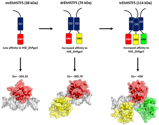 Our in vitro findings demonstrate that the mrEhHSTF5 protein is capable of oligomerizing, forming dimers and trimers. Furthermore, through EMSA assays and in silico molecular docking, we discovered that the dimeric conformation exhibits greater affinity for HSE_EhPgp5 compared to the monomeric conformation. Dorantes et al. [28] reported higher affinity (−459) binding of tEhHSTF5 to the same HSE, supporting our results and indicating that the degree of oligomerization increases the affinity for HSE_EhPgp5. OD; Oligomerization Domain, DBD; DNA Binding Domain, Ds; Docking Score.