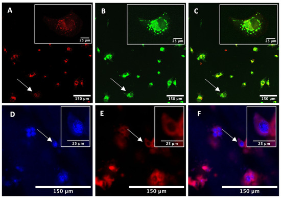 Confocal images of HEY cells in 2D monolayer models (A–C) and 3D construct models (D–F). (A–C): Cells were co-treated with 1 μM porphyrin TPPS2a for 24 h and 100 nM Lysotracker Green. (A) TPPS2a fluorescence using 405 nm excitation; (B) Lysotracker Green fluorescence using 488 nm excitation; (C) represents an overlay image of (A,B). The scale bar presented in each image is 50 μm. (D–F): 3D constructs were treated with 1 μM porphyrin TPPS2a for 24 h. Prior to imaging, the constructs were stained with 10 μM DAPI (blue) and incubated for 30 min. The porphyrin TPPS2a (E) was imaged in the same manner as in the 2D model, and (F) is an overlay of (D,E). The scale bar presented in each image is 150 μm. Scale bar for the magnified images in insets highlighted by arrows is 25 μm.
