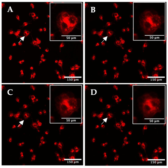For the 2D monolayer model, the cells were treated with 2 μM TPPS2a for 24 h prior to confocal imaging. Cells were illuminated at 405 nm (Figure 2A), and an image was initially captured after 1 min of illumination (2B). A noticeable difference can be observed between image A and B, where fluorescence associated with punctate endolysosomal vesicles is clearly visible in image A (see inset). However, after 1 min of light exposure, the fluorescence became blurred and at longer exposure times (Figure 2C,D) resolution of endolysosomes is no longer apparent, consistent with the degradation of endolysosomal membranes due to photo-oxidative damage. Following 5 min of light exposure, the mean cellular intensity decreased by 24.7% ± 0.2%, indicating photobleaching of the fluorescence. Confocal imaging of the porphyrin fluorescence was attempted in 3D constructs but the resolution was insufficient to detect redistribution effects clearly, although the porphyrin fluorescence was localised to the spheroids within the construct. Photobleaching was also observed as in Figure 2D (see Supplementary Materials, Figure S1). A z-stacked image of a 3D construct stained with DAPI is shown in Figure S2.