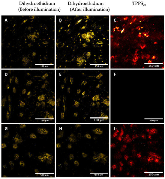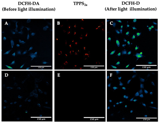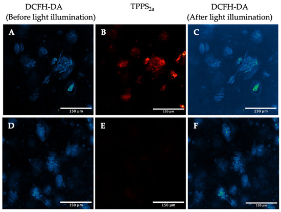 Similar results were obtained with the 3D construct models when the cells were incubated with TPPS2a and DCFH-DA. A mean increase in DCFH-DA fluorescence in the spheroids by 83% ± 21% was observed following light illumination at 405 nm for 5 min (Figure 4A–C). No significant increase in DCFH-DA fluorescence was observed when the cells were incubated only with DCFH-DA (Figure 4D–F).