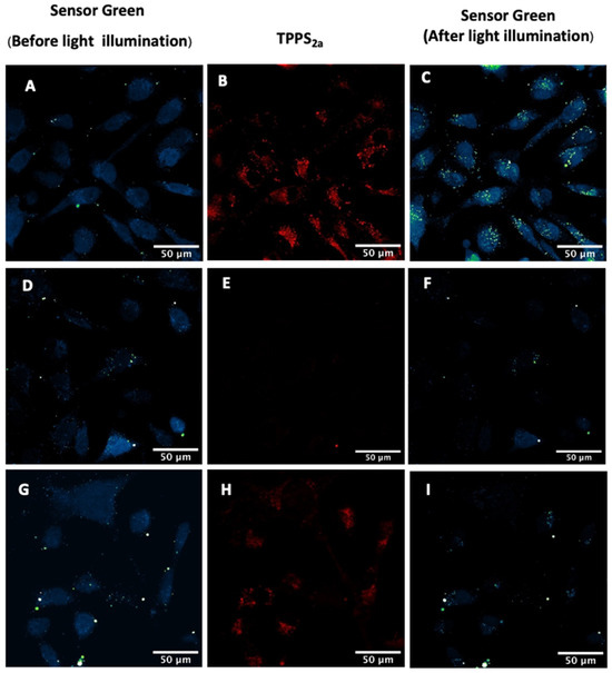 Detection of reactive oxygen species using Sensor Green (SG) following 405 nm illumination. Cells were treated with 1 μM TPPS2a and incubated for 22 h prior to imaging. For the detection experiment, 10 μM SG was added to the cells for a further 2 h prior to imaging, and for the inhibition experiment, 10 μM SG and 25 mM NaN3 were added for 2 h prior to imaging. (A) SG fluorescence before on-stage illumination; (B) TPPS2a fluorescence; (C) SG fluorescence after illumination. TPPS2a images are shown in red, fluorescein in false colour (blue, low; green, high). (D–F): Control sample treated with only SG showing SG fluorescence (D,F) after illumination using 405 nm laser with no TPPS2a present (E). (G–I): Inhibition of singlet oxygen in co-treated (SG + TPPS2a + NaN3) sample, where SG (G,I) and TPPS2a (H) were detected as described above. The scale bar presented in each image is 50 μm.