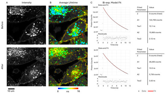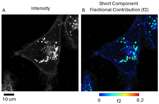 In Equation (1), I represents intensity, A1 and A2 are amplitudes in units of photon counts, t represents time in ns, and tau1 and tau2 are the fitted lifetimes (tau1 is always assigned the longer lifetime). The background Z was fixed to zero in all fitting, because the measured lifetimes were expected to be near the 12.4 ns total measured period. Average lifetimes were determined with a mono-exponential model by setting A2 = 0. Global bi-exponential fitting was performed as previously described [61], which fixed tau1 and tau2 across the image while allowing A1 and A2 to vary. Fractional lifetime contribution of the short component was calculated using the equation:
