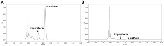 Qualitative and quantitative HPLC analysis of osthole and imperatorin in the fruit of C. monnieri: (A) 50% ethanol extract (CME); (B) water extract (CMW). The retention times of the peak levels of imperatorin and osthole were 4.37 min and 5.25 min, respectively.