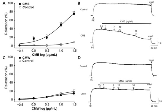 The vasorelaxant effects of the CME and CMW were evaluated using phenylephrine (PE) pre-constricted rings in Krebs–Henseleit (KH) buffer. The CME caused a relaxation response in a concentration-dependent manner (0.3, 1, 3, 10, and 30 μg/mL). The maximal vasorelaxant effect of the CME at 30 μg/mL on PE-induced contraction was 75.28 ± 2.28% (Figure 2A). The half-maximal effective concentration (EC50) of the CME was 10.19 ± 0.55 μg/mL. There was no significant difference between the CMW and the control until the dose reached 30 μg/mL (Figure 2C).