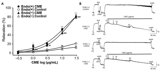Vasorelaxant effects of C. monnieri 50% ethanol extract (CME) in endothelium-intact or endothelium-denuded rat aortic rings: (A) Cumulative concentration–response curves and (B) representative traces of CME on endothelium-intact [Endo (+)] or endothelium-denuded [Endo (−)] rat aortic rings pre-constricted with phenylephrine (PE, 1 μM). An unpaired t-test was employed for statistical comparisons. Values are expressed as mean ± SEM (n = 4). * p < 0.05, *** p < 0.001 vs. Endo(+) control. ## p < 0.01, ### p < 0.001 vs. Endo(−) control.