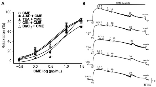 Pre-incubation with potassium channel blockers, such as 4-aminopyridine (4-AP), tetraethylammonium (TEA), glibenclamide (Glib), or Barium chloride (BaCl2), significantly decreased the CME-induced relaxation of the endothelium-intact aortic rings pre-constricted by PE. In the presence of 4-AP (1 mM), TEA (1 mM), Glib (10 µM), and BaCl2 (10 µM), the maximum relaxation effects of the CME were 69.93 ± 2.28%, 85.59 ± 2.81%, 82.30 ± 4.88%, and 84.78 ± 3.34%, respectively, at a 30 µg/mL concentration (Figure 4).