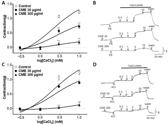The cumulative addition of calcium chloride (CaCl2, 0.3–10 mM) gradually induced the contraction of the rat aortic rings pretreated with PE (1 µM) and potassium chloride (KCl, 60 mM) in the Ca2+-free KH buffer. Pre-treatment with CME (30 and 300 µg/mL) significantly attenuated the constriction induced by CaCl2 compared to that in the control group (Figure 5).