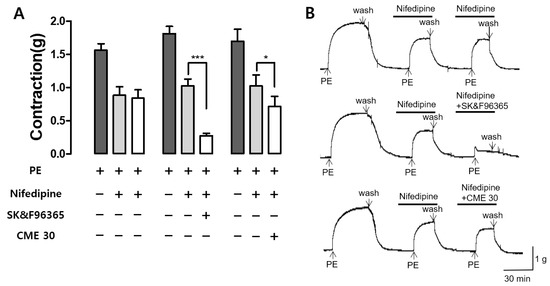 Effect of C. monnieri 50% ethanol extract (CME) and SK&F96365 on phenylephrine (PE)-induced contraction in the presence of nifedipine: (A) The effects and (B) traces of CME (30 µg/mL) on PE-induced contraction in the presence of nifedipine (10 µM). Statistical comparisons were conducted using an unpaired t-test. Values are expressed as mean ± SEM (n = 4). * p < 0.05, *** p < 0.001.