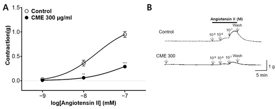 We assessed the inhibitory effect of CME (300 µg/mL) on angiotenin II (Ang II, 10−9–10−7 M)-induced vasoconstriction of the endothelium-intact aortic rings. The CME pre-treatments significantly inhibited the constrictions to 0.29 ± 0.03 (g), while the constriction levels in the control group were 0.95 ± 0.06 (g) (Figure 7).