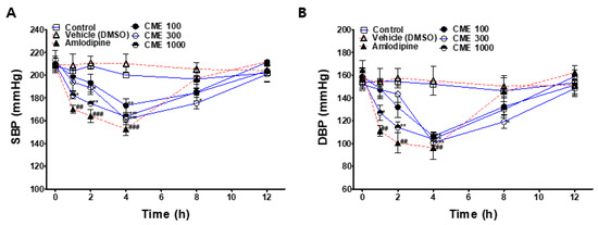 To confirm the hypotensive action of CME, the SBP and DBP of the SHRs were measured after oral administration of the drug using a non-invasive tail-cuff method. The SBP and DBP significantly decreased after 4 h of CME administration (100, 300, and 1000 mg/kg), suggesting that it may be effective in lowering blood pressure in humans when consumed at doses higher than 8.11 mg/kg. As a positive control, amlodipine (1 mg/kg) was injected intraperitoneally, and both the SBP and DBP significantly decreased at 1, 2, and 4 h after injection. Twelve hours after CME administration, the blood pressure recovered to the baseline.