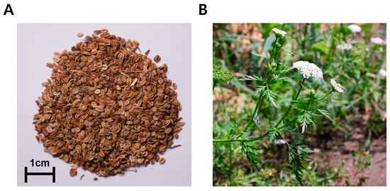 The morphology of Cnidium monnieri (L.) Cusson used in the experiment: (A) the fruit; (B) the whole plant. The photographs were taken before the experiment.