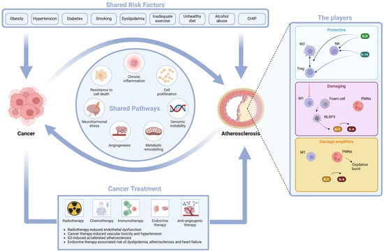 Central illustration of atherosclerosis and cancer: shared risk factors, shared pathways, cancer therapy-induced vasculotoxicity; the characters of the atherosclerotic play: the protective characters, the damaging characters, and the damage amplifiers.