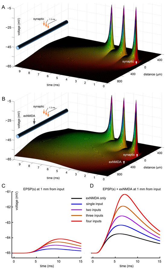Makarov, M.; Papa, M.; Korkotian, E. Computational Modeling of Extrasynaptic NMDA Receptors: Insights into Dendritic Signal Amplification Mechanisms. Int. J. Mol. Sci. 2024, 25, 4235. https://doi.org/10.3390/ijms25084235
