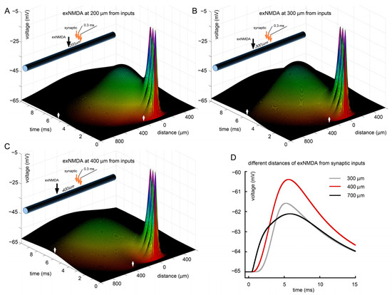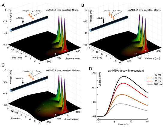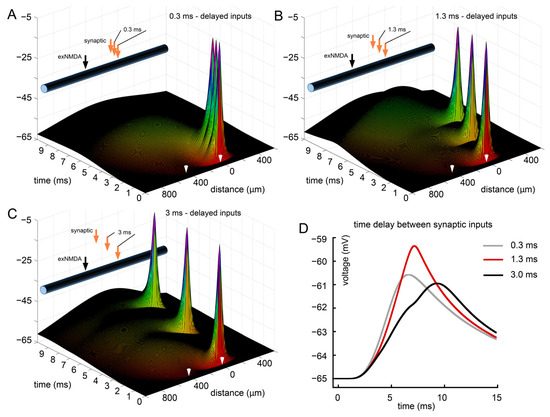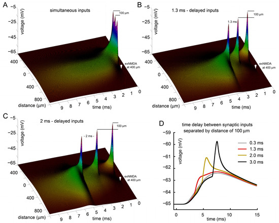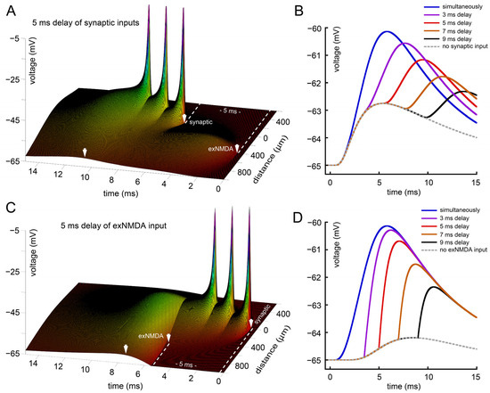 2.4. Effect of Spatiotemporal Distribution of EPSPs on the Interaction with exNMDA