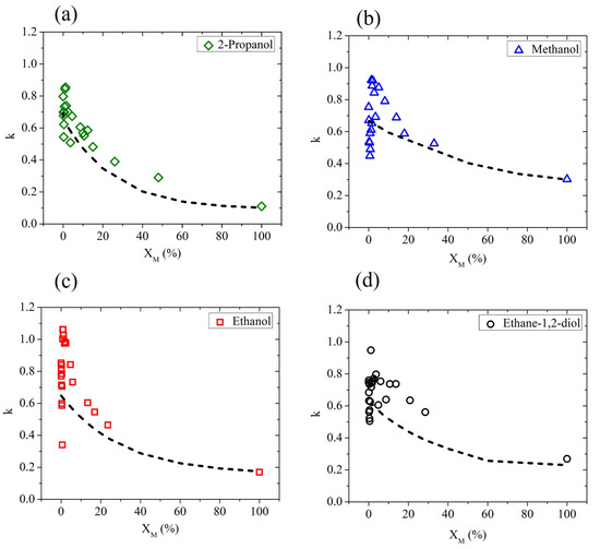 The experimental values (averaged over four different frequency points: , and THz) of k in aqueous binary mixtures based on (a) 2-propanol, (b) methanol, (c) ethanol, and (d) ethane-1,2-diol measured as a function of the solute molar fraction (solid points). Dot-dashed lines describe the prediction of the effective Debye model.