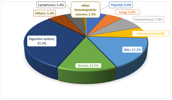There are many reports about the risk of developing cancer in patients with IBD. Many potential risk factors are considered. In the work of Biancone et al., they determined the most common types of cancer in patients with IBD, noting that lymphomas and leukemias were observed only in patients with CD (Figure 1) [17].