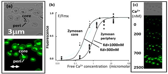 Properties of fluo4-zymosan particles. (a) The phase contrast (upper) and fluorescent (lower) appearance of zymosan particles in 1.3 mM Ca2+, with the dense “core” and the transparent periphery indicated. (b) The relationship between free Ca2+ concentration and fluorescence intensity from the core and peripheral regions of individual zymosan particles. Individual experimental data are shown as F/Fmax (with separate symbols), together with the theoretical relationship (lines) shown for two dissociation constants (kd). (c) A sample experiment showing the same microscopic field; top = phase contrast; then florescence images in the same field at the Ca2+ concentrations indicated.