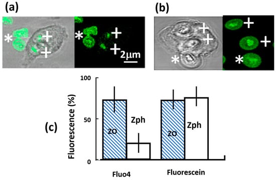 Comparison of fluorescein and fluo4-coupled zymosan particles. In (a,b), the phase contrast and corresponding fluorescent images are shown for (a) fluo4-coupled zymosan and (b) fluorescein-coupled zymosan. Both sets of images show the internalised particles, marked by a “+” and external particles by a “*”. (c) The quantitation of fluorescence from fluo4 and fluorescein particles either outside the cell (ZO) or inside a phagosome (Zph). The fluorescence units were arbitrary but were comparable, as measurements were taken from the same microscopic fields with the same excitation strength and detection sensitivity. The bars show the mean and the vertical line shows the range for at least 50 determinations.