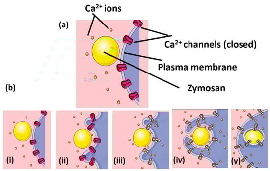 Proposed sequence of Ca2+ channel opening on the phagosomal membrane. (a) A “cartoon” of some of the components of the proposed model system. The phagocyte plasma membrane with Ca2+ ion channels (closed) before contact with the phagocytic target (zymosan particle) and Ca2+ ions is labelled. (b) The proposed sequence of events during phagocytosis are shown as follows. (i) Before contact between the phagocyte and the target, where the cytosolic free Ca2+ ion concentration is low. (ii) Contact between the particle and the phagocyte, resulting in the formation of a phagocytic cup, with the Ca2+ ion channels remaining closed and the cytosolic free Ca2+ ion concentration still low. (iii) A critical number of receptors are engaged, the Ca2+ channels remain open, and the cytosolic free Ca2+ ion concentration begins to rise. Note that the location of the open Ca2+ channels includes the portion of plasma membrane that forms the base of the forming phagosome and thus provides a mechanism for preferentially elevating Ca2+ near the forming phagosome. (iv) In response to the elevated cytosolic free Ca2+ ion concentration, the pseudopodia around the target nearly enclose it, trapping Ca2+ ions in the forming phagosome. (v) Phagocytosis is complete but Ca2+ channels remain open on the phagosomal membrane, such that intra-phagosomal Ca2+ leaks out into the surrounding cytosol. Once “drained” of Ca2+, the phagosome plays no further role in Ca2+ signalling.