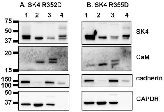 | R355D | + | 20/3 | 59 ± 23 p < 0.001 v. SK4 WT + native CaM | 37/5 | 330 ± 172 p < 0.001 v. Empty vector + CaM WT p < 0.001 v. SK4 R355D + native CaM |