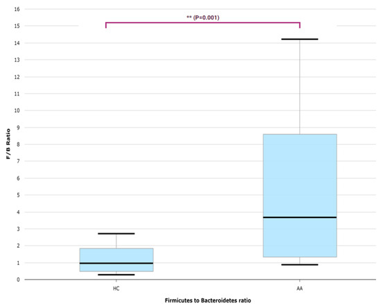 The major genera that constitute the gut microbiome’s core were Bacteroides, Blautia, Faecalibacterium, and Prevotella in both AA and HC groups (Figure 1). In the AA group, the most observed genera were in the order of Bacteroides, Blautia, Faecalibacterium, and Prevotella, while in the HC group, they were observed in the order of Bacteroides, Prevotella, Faecalibacterium, and Megamonas. A distinct difference in the proportions occupied by the microbiota was observed. The Firmicutes to Bacteriodetes (F/B) ratio was significantly higher in the AA group compared with the HC group (p < 0.05; Figure 2).