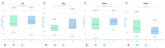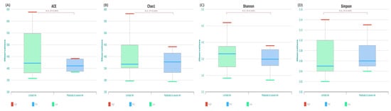The microbiome taxonomic profiling cloud of EZBiocloud was used to analyze the taxonomic bacterial profiling [39]. After normalization based on 16S rRNA gene copy number variation, various analyses were conducted: alpha- and beta-diversity indices and LEfSe for identification of biomarkers [40,41]. Species richness was measured by Chao, ACE, and number of operational taxonomic units. Diversity indices were expressed with Shannon and Simpson indices. Beta diversity was measured using Bray–Curtis distances, and the statistical significance was analyzed using permutational multivariate analysis of variance. For LEfSe analysis, taxonomic levels with an LDA score higher than 3 and p-value < 0.05 were considered statistically significant [18,40].
