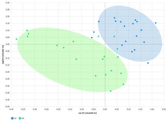 Principal coordinate analysis results were plotted based on unweighted UniFrac dissimilarity between samples to compare the compositions of the gut microbial communities. The bacterial community compositions in AA patients were significantly different from those of HCs according to Jensen–Shannon dissimilarities (p < 0.05; Figure 4).