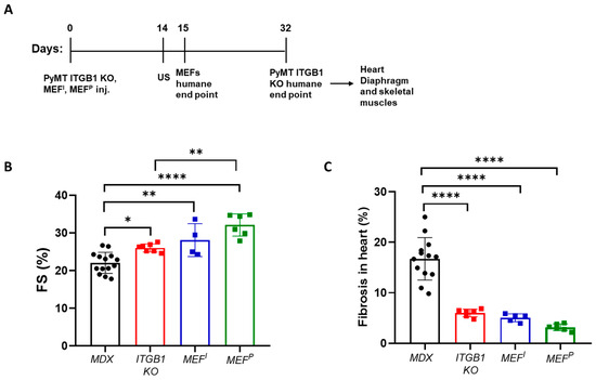 2.1. PyMT ITGB1 KO, MEFI, and MEFP Cells Ameliorate Heart Contractile Dysfunction and Suppress Fibrosis in the MDX Mice